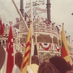 Probably more than almost any original worlds of Fun attraction, excepting possibly the Zambezi Zinger, Cotton Blossom ranks as one of the most missed and most beloved. Cotton Blossom was a 172-foot long, three-story, sternwheeler paddleboat model, built originally in 1951 for the MGM hit "Show Boat" at a cost to MGM studios of $375,000, it took eight months to originally build. Following its use in "Show Boat", Cotton Blossom was used for several other feature films including "Raintree County", and several commercials. When originally built, Cotton Blossom could technically "float" as it was built onto steel pontoons but was powered not by steam but by two diesel engines, and controlled by cables and winches. It, like thousands of other props both large and small, was put up for auction in the famous MGM Backlot Auction of 1970. There along with Victrix, and multiple other small ships and props was bought by Lamar Hunt for a winning bid of $15,000. The hard part wasn't so much the purchasing or dismantling of Cotton Blossom, but the reassembly. Technically, as the story goes, each piece was numbered and recorded on the original blueprints so that it could be reassembled. It took six railcars to ship Cotton Blossom, in pieces, back to Kansas City, and it was stored in underground facilities until 1972. Reconstruction began in July 1972, but soon there proved to be problems, as not every piece was labeled, or even labeled correctly, and there were questions as to the feasibility of even being able to reassemble such large ships. We all know how that story ended, and on May 26, 1973, festooned with dignitaries, and locals alike, Cotton Blossom was the site of the grand opening ceremonies for Worlds of Fun. For 23 years, it stood as an attraction at the park Cotton Blossom was visible towering regally over the park and its entrance from almost any vantage point, it was one of the first attractions visible to guests entering the park, and it provided a grand opening act as anyone could have hoped. Beyond being simply a visible attraction, Cotton Blossom was also home to multiple shops, restaurants, and shows throughout its years. The Dixieland band was located on its stern for several seasons and included various melodrama skits over the first few seasons as well. A large boutique was located on the ships main deck, and the antique photoshop was also located on the Cotton Blossom until its last season at the park in 1995. If you wanted a bite to eat you could even grab lunch at the Paddlewheel Cafe located third-deck, stern until 1987. Made of wood, and designed only as a temporary prop for a movie, Cotton Blossom was never designed originally to live forever. However, at least initially, Hunt Midwest saw it as a prized possession and treated it as such with Cotton Blossom receiving a full-scale renovation at least once in the 1980's. Sadly, the decade of the 90's told a whole different story. By then both Victrix and Cotton Blossom where suffering from disrepair, Victrix was the first to go in 1993, pulled out of the park by Hunt Midwest themselves. Cotton Blossom stayed though and languished on, but it was clear that its days were numbered as many park ambassadors began giving it the sad nickname of "rotten blossom". Though decaying from the inside out, Cotton Blossom still maintained its regal outward appearance until its last day in October 1995. It was removed following the 1995 season and replaced by a new pay-extra attraction Ripcord that still stands in its place, over the pond originally built for Cotton Blossom. Relevant Links and SourcesShowboat "Cotton Blossom" (Hollywood Guy):http://www.hollywoodgoldenguy.com/MGM_Cotton_Blossom.html YouTube VideosCotton Blossom, MGM Backlot Auction Video 1951 MGM "Show Boat" introduction featuring Cotton Blossom Additional PhotosBack to Defunct Attractions |
