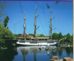 When Worlds of Fun opened it was full of artifacts purchased by Hunt Midwest in the 1970 MGM Backlot auction, one of the largest purchases included two full-size ships, the Cotton Blossom and the Victrix. The Victrix was a 110' foot-tall, full-size, three-masted pirate ship that served as a man-o-war cannon firing range in the early years of the park. Like Cotton Blossom, Victrix was a movie star in its own right. It was originally built in 1950 for the movie "The Running of the Tide" which was canceled before completion. It was converted to a whaling ship and re-christened as the Nathan Ross for the 1953 movie "All the Brothers were Valiant". The art director of "All The Brothers were Valiant" was Randall Duell who would twenty years later design Worlds of Fun, as well as many other theme parks of that time period. Over the next decade, Victrix was reused for several other movies include "Young Bess" in 1953, "Scarlet Coat" in 1955, and the rigging and sail areas were used in the 1962 "Mutiny on the Bounty". Victrix also appeared notably in many television productions including "The Man From Uncle". Victrix was sold as part of Lot #3, on May 15th for an unknown amount, it's catalog id was 3/710. Victrix like Cotton Blossom was supposably numbered and disassembled, then they were both transported to the Hunt Midwest caves where they sat, unassembled waiting to rise again into the sky. The story of Cotton Blossom is more widely known since it is the more widely recognized of the two, but the story is most likely the same with Victrix. The story goes that not all the "supposedly" numbered pieces weren't numbered and it became a literally three-dimensional puzzle to put both Victrix and Cotton Blossom back together again for opening in 1973. Thankfully, both seemingly impossible tasks were completed. YouTube VideosIntroduction to "All The Brothers Were Valiant" (Victrix starts at 1:22) Additional PhotosBack to Defunct Attractions |
